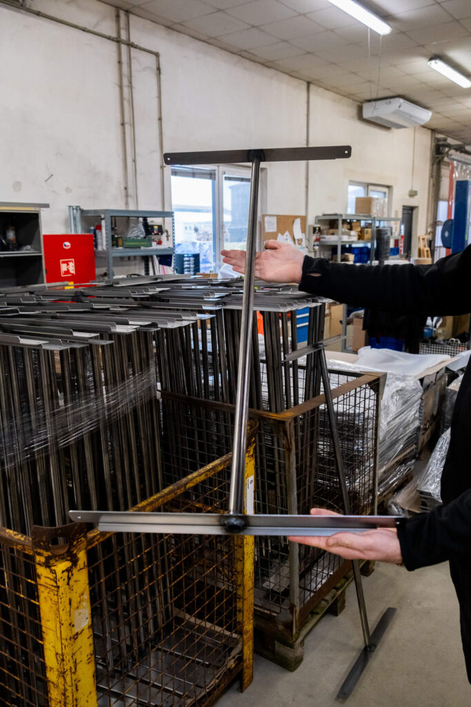 Výroba probíhá kompletně v našem zázemí – od tváření plechů a profilů, přes svařování, broušení a povrchovou úpravu až po finální kompletaci.